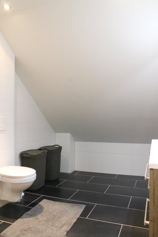 Overloop met toegang tot twee slaapkamers, een ruime badkamer voorzien van douchecabine, toilet en dubbele wastafel, en een praktische berging met aansluitmogelijkheden voor witgoed.