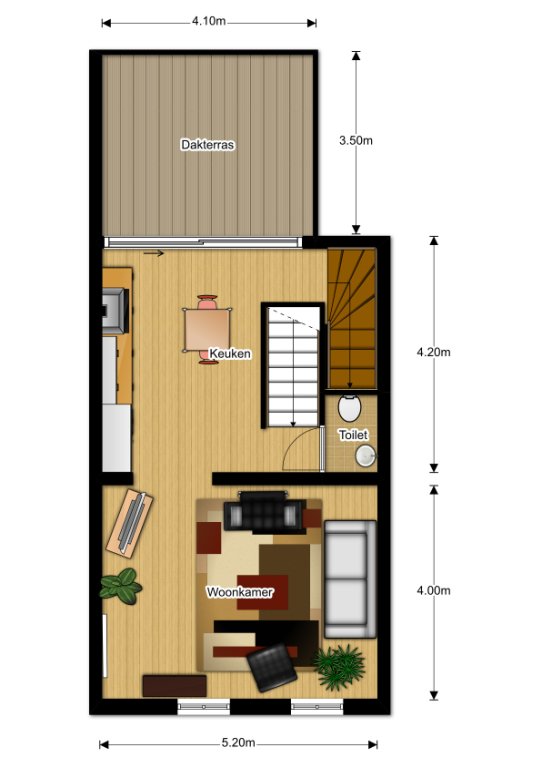 De keuken is uitgerust met een koelkast, kookplaat, afzuigkap, oven en vaatwasser. Vanuit de keuken is het royale dakterras toegankelijk.