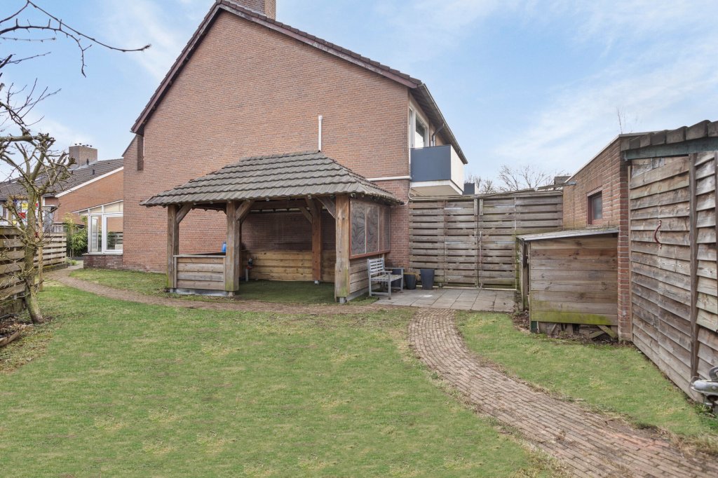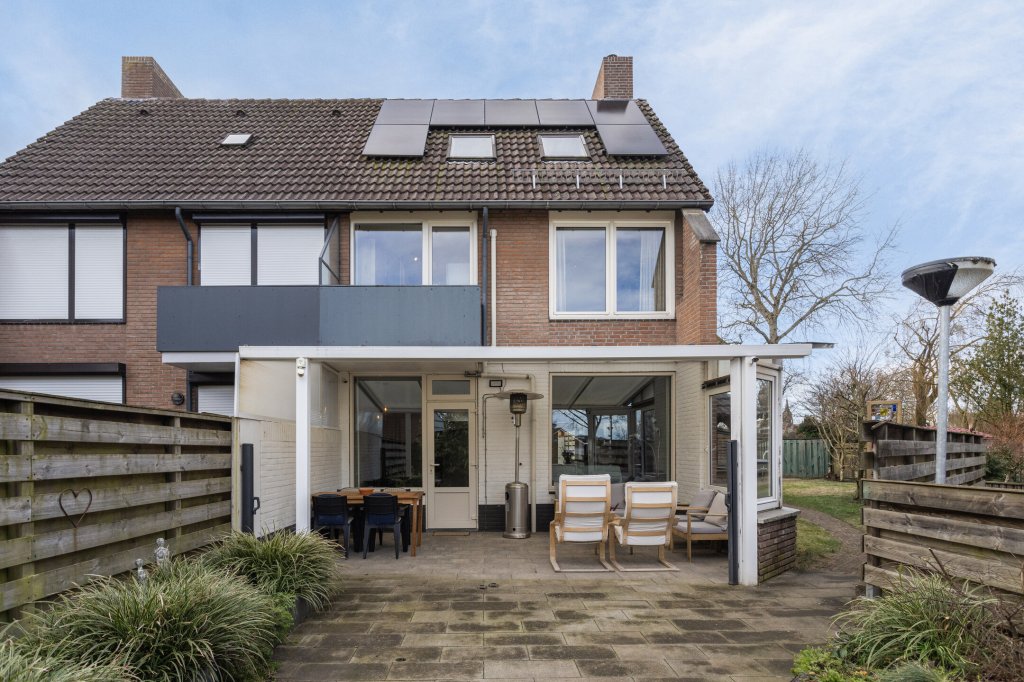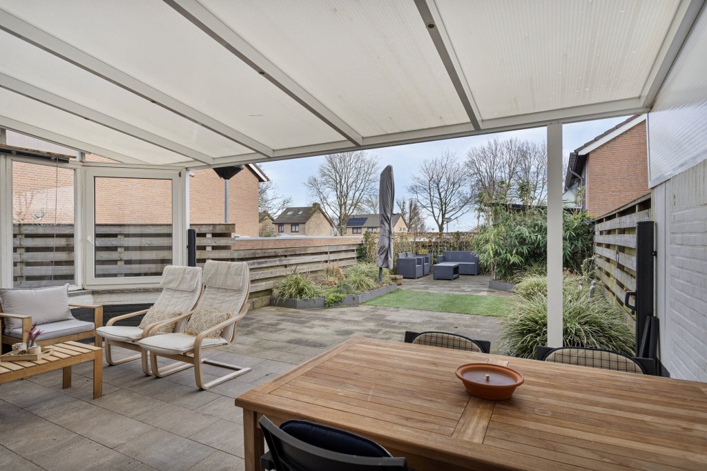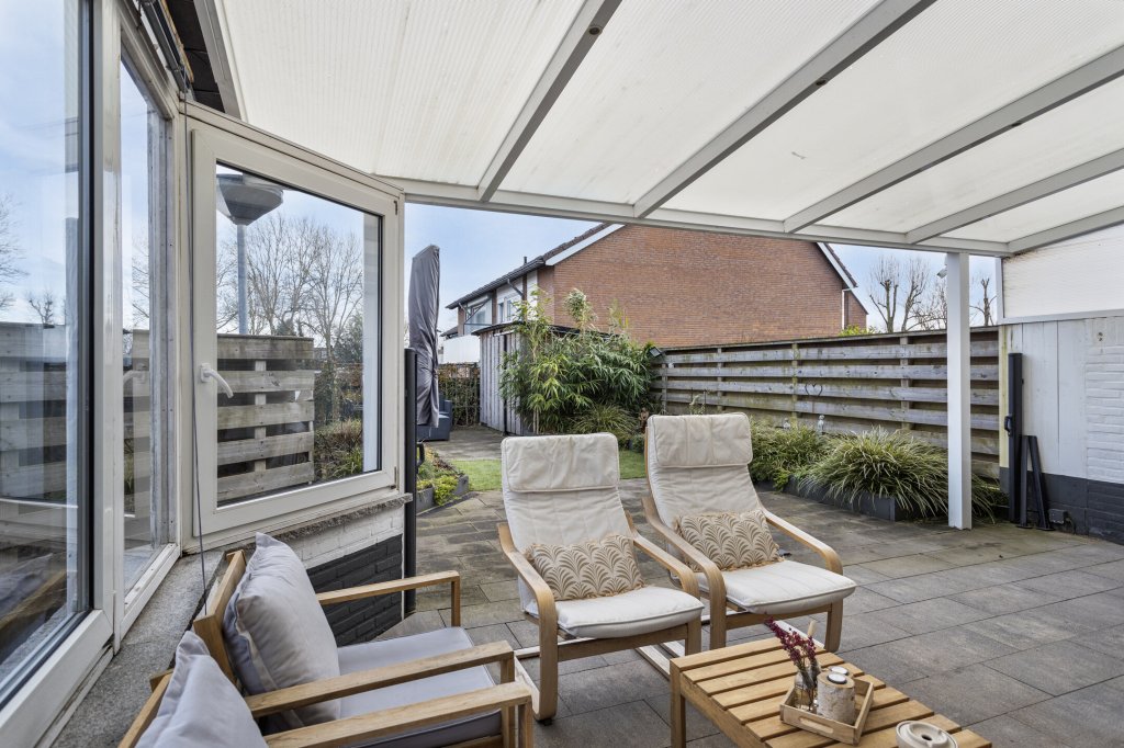 Aan de achterzijde bevindt zich een fijne overkapping, perfect voor zomeravonden of om beschut buiten te zitten. Vanuit hier loopt u door naar de royale achtertuin, voorzien van een groot terras, een tuinhuis, extra overkapping en volop privacy. De tuin is bereikbaar via een afsluitbare achterom. Daarnaast beschikt de woning over een ruime garage én extra bergingen — ideaal voor fietsen, hobby’s of opslag.
