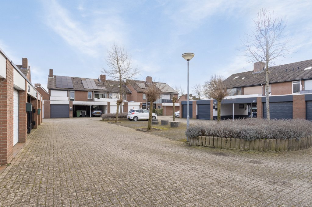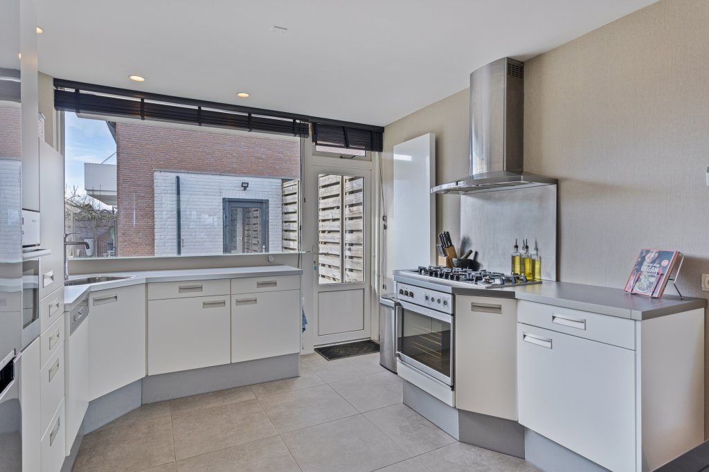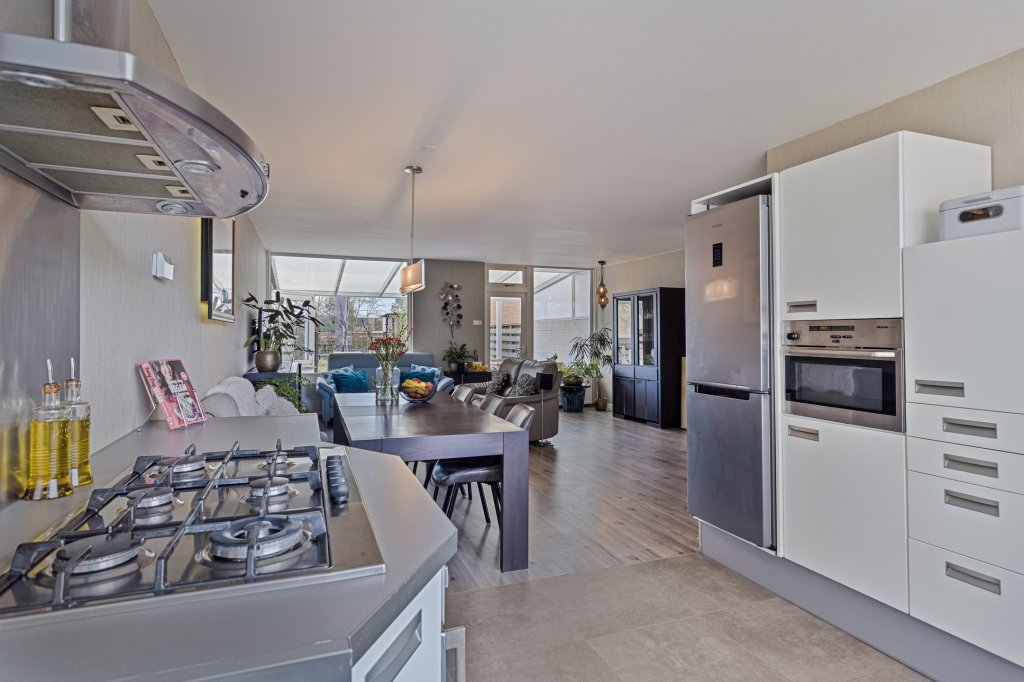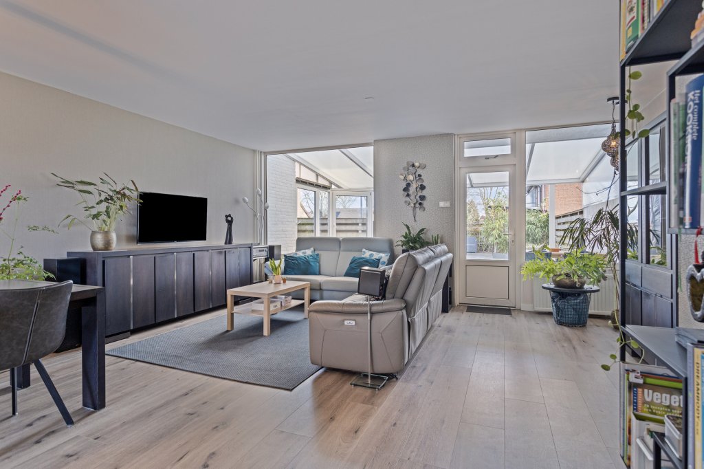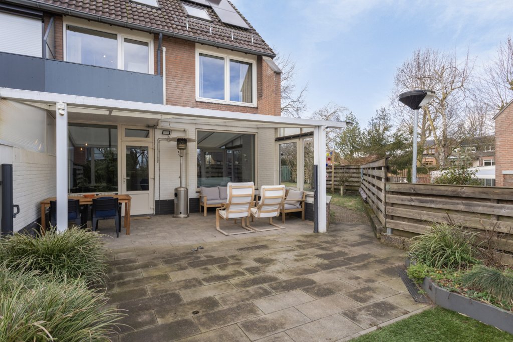 Aan de achterzijde bevindt zich een fijne overkapping, perfect voor zomeravonden of om beschut buiten te zitten. Vanuit hier loopt u door naar de royale achtertuin, voorzien van een groot terras, een tuinhuis, extra overkapping en volop privacy. De tuin is bereikbaar via een afsluitbare achterom. Daarnaast beschikt de woning over een ruime garage én extra bergingen — ideaal voor fietsen, hobby’s of opslag.