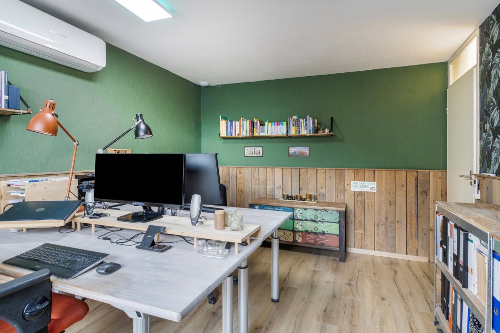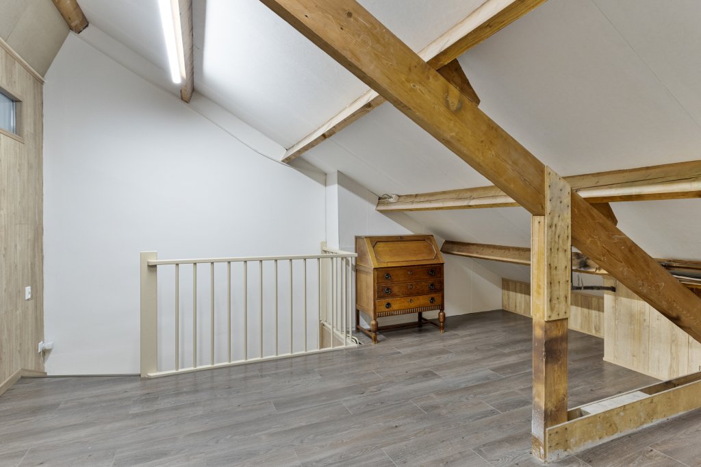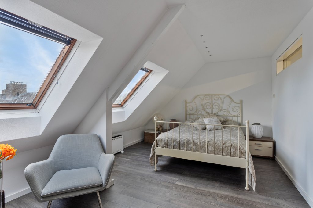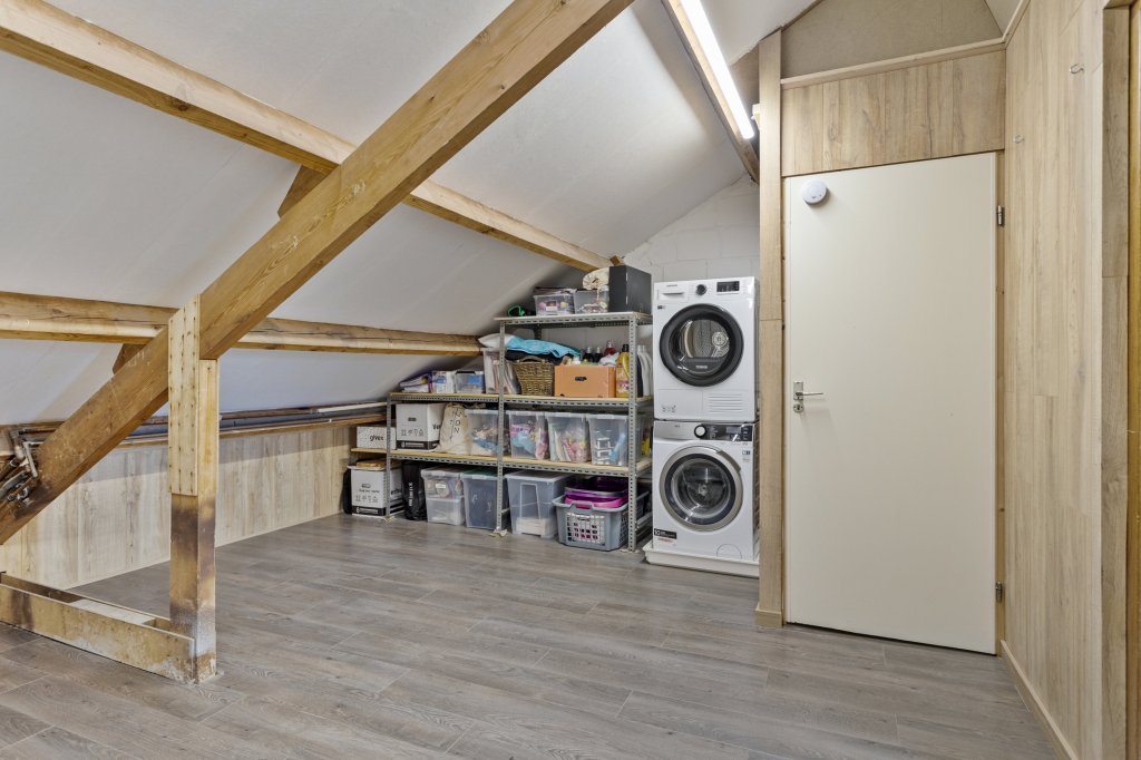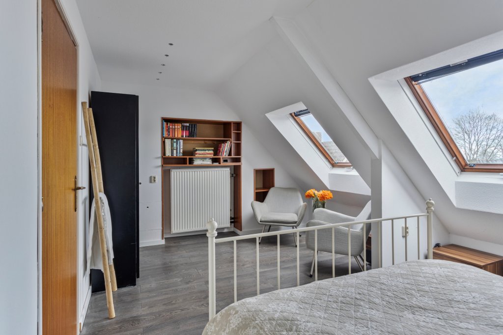 Via een vaste trap bereikt u de tweede verdieping. Hier bevindt zich een ruime overloop met uitstekende opbergmogelijkheden, witgoedaansluitingen en toegang tot de vierde slaapkamer, die dankzij het dakraam prettig licht en bijzonder veelzijdig is.