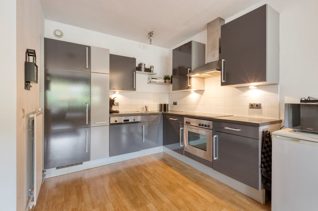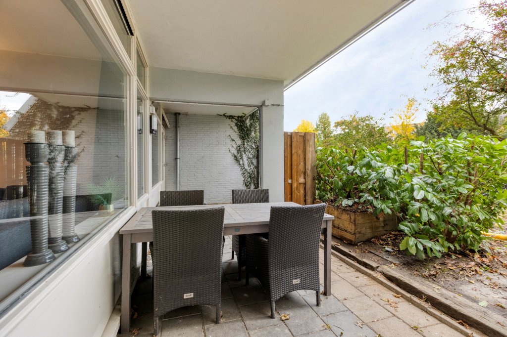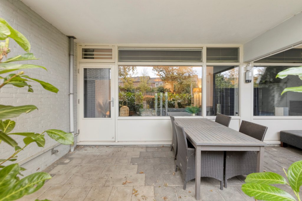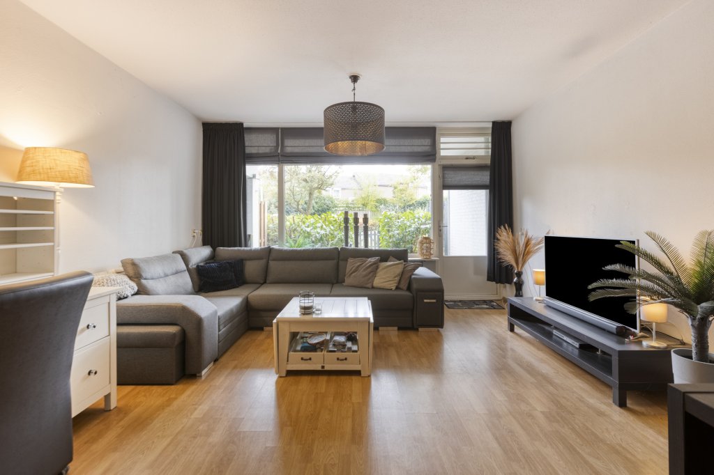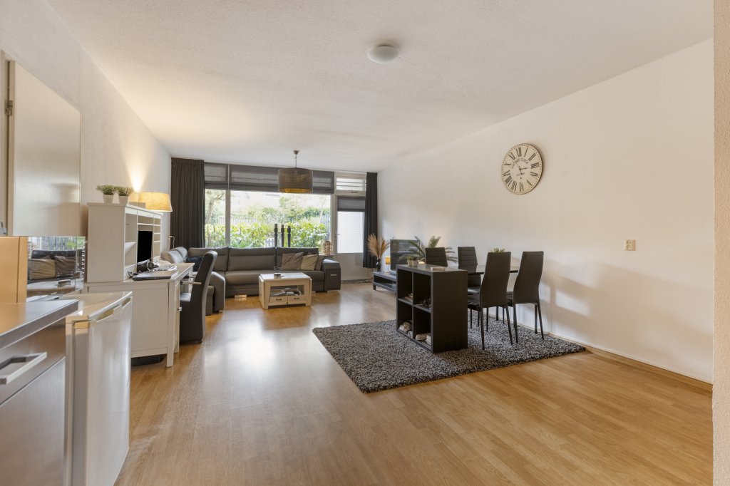 Entreehal met garderobe meterkast. De lichte en ruime woonkamer beschikt over een open keuken in L-opstelling, voorzien van diverse inbouwapparatuur, waaronder koelkast, oven, keramische kookplaat, afzuigkap, vaatwasser en voldoende opbergruimte. Vanuit de woonkamer is er toegang tot het royale overdekte terras, ideaal voor een ontspannen buitenmoment.